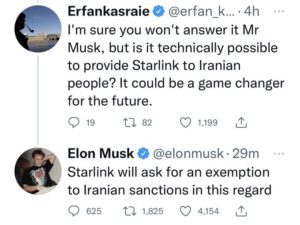 ماسک این توییت را در پاسخ به توییتی از عرفان کسرایی، همکار بخشی فارسی دویچه وله نوشت که از او پرسیده بود: «آیا از نظر فنی امکان ارائه استارلینک به ایرانیان وجود دارد؟ این میتواند یک تغییر بازی برای آینده باشد.»